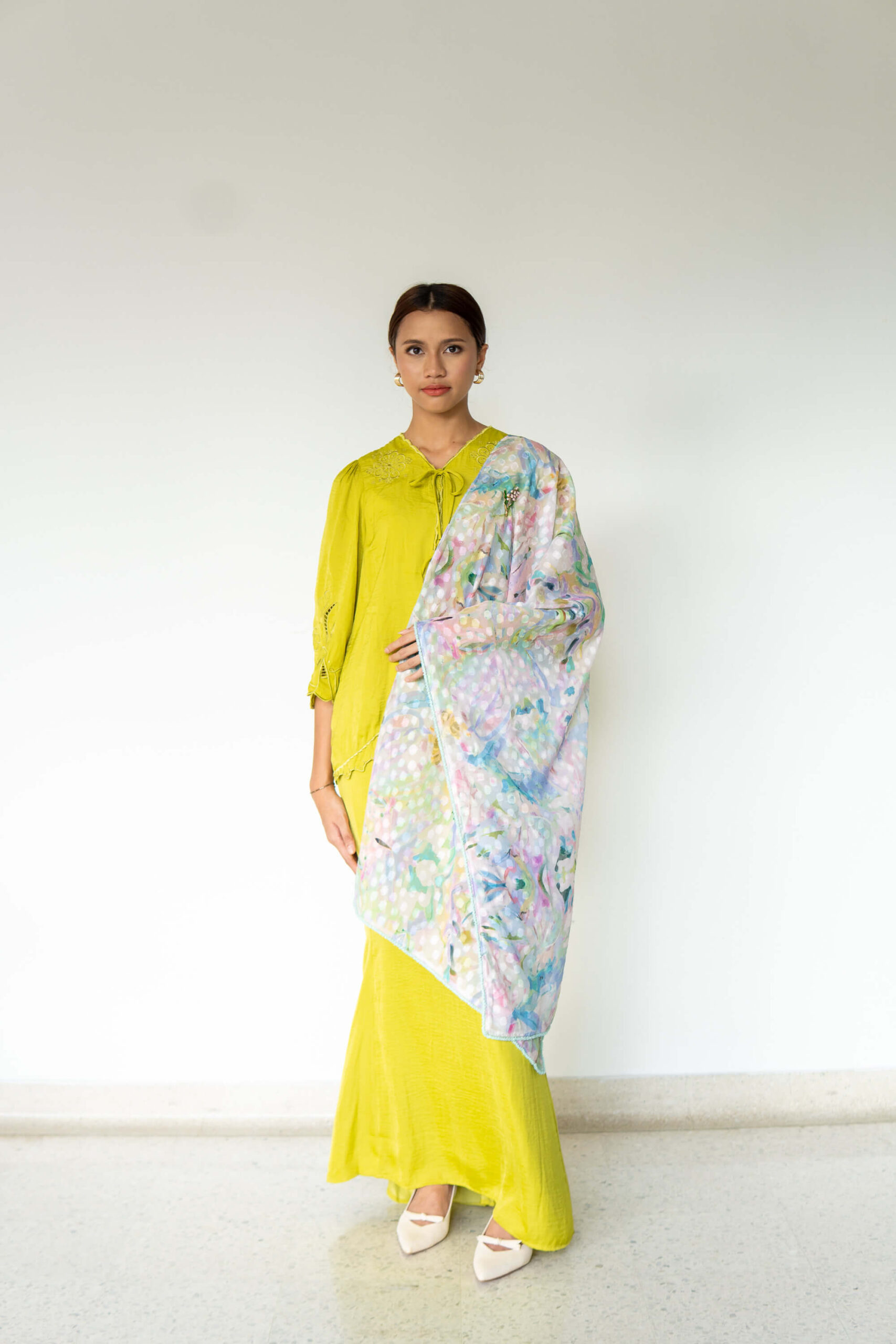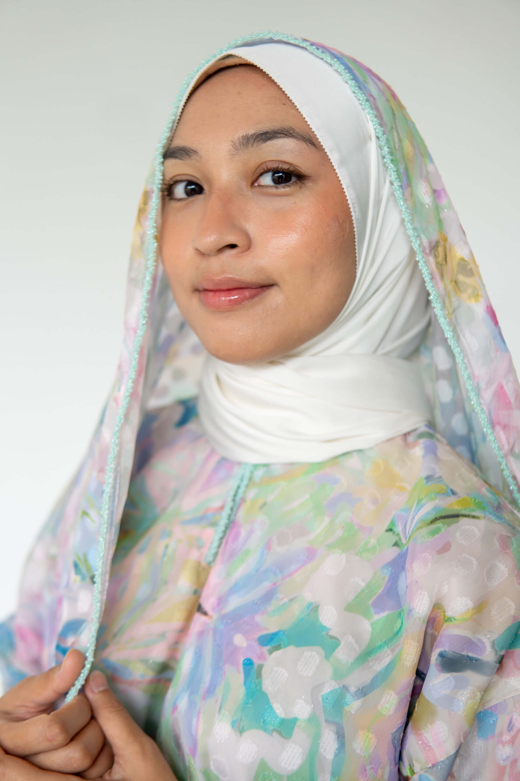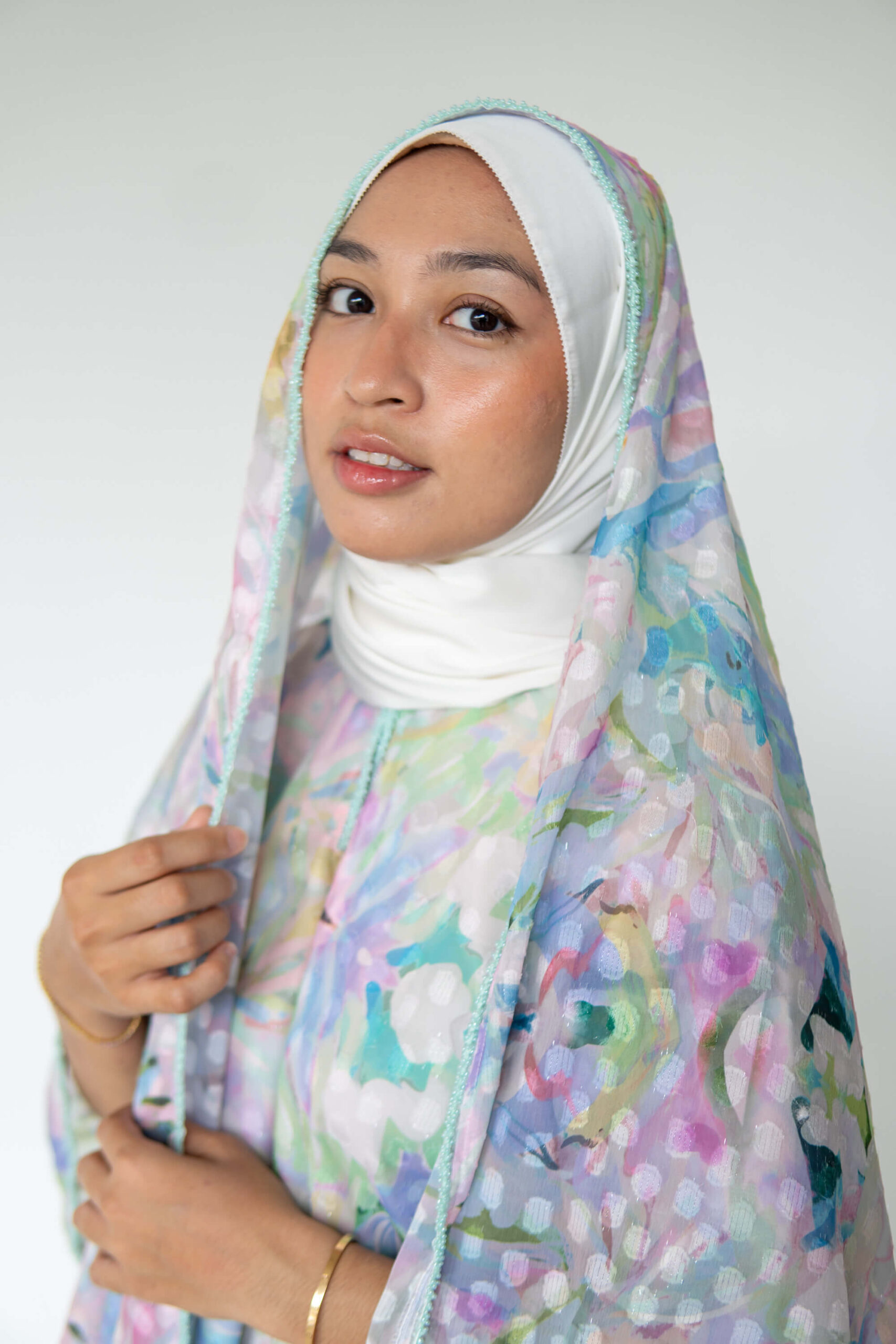 Introducing our very first scarves collection. Designed in a soft, subtle tiffany hue, Paloma Scarves represent timeless and elegance design prints. Feature delicate patterns that add a gentle touch of femininity, the muted floral motifs blend seamlessly into the base tone, creating a refined and understated look that complements the whole look.