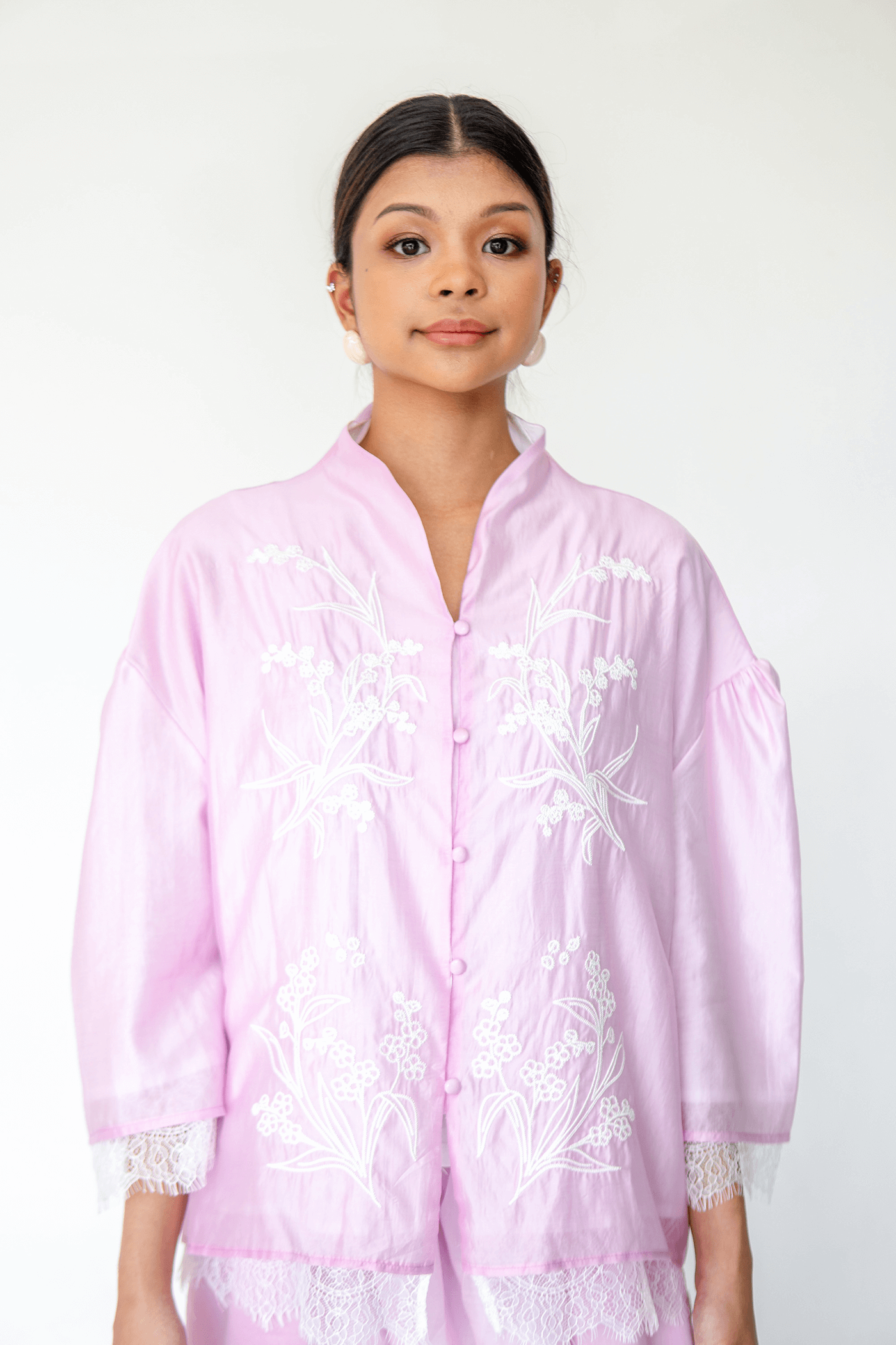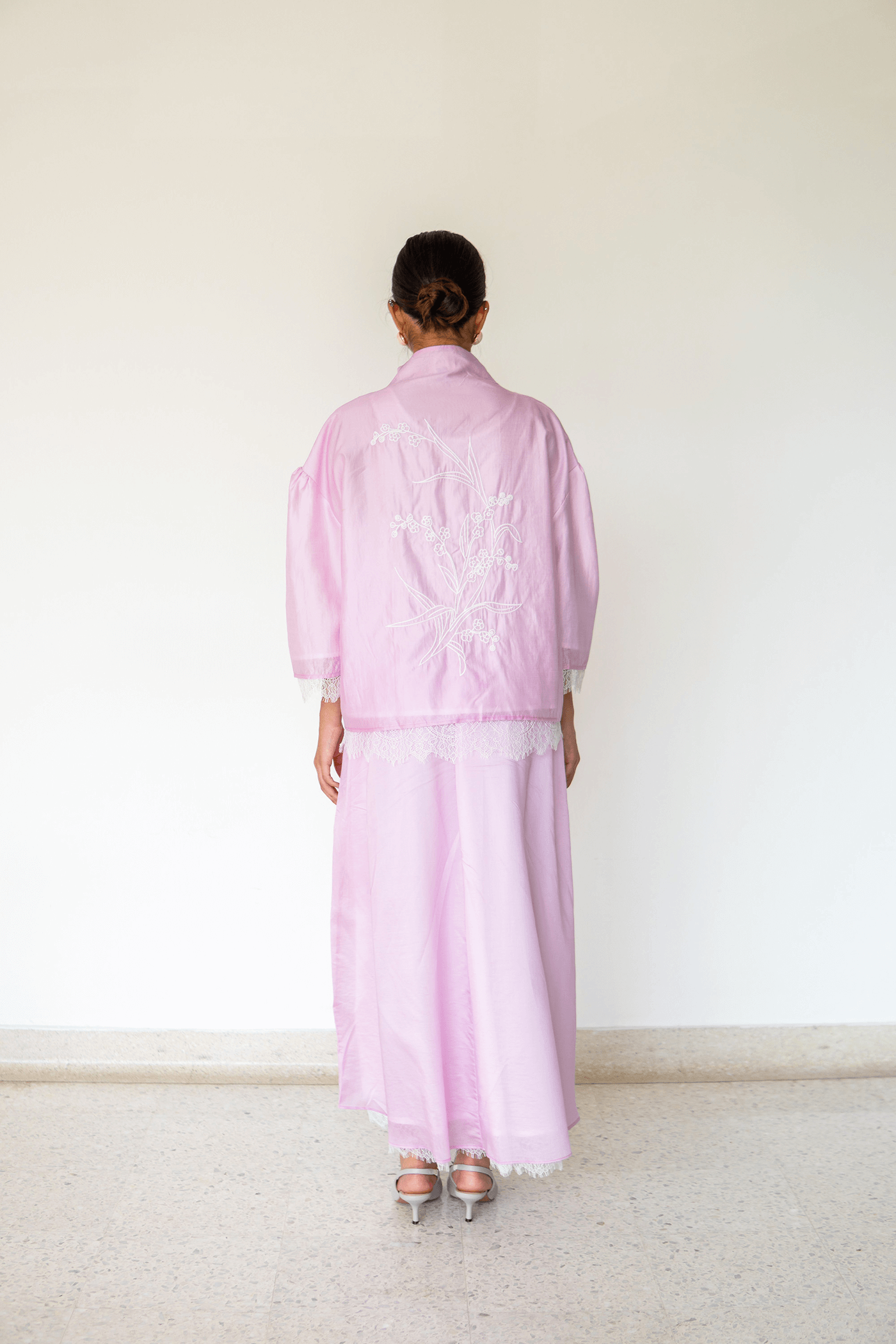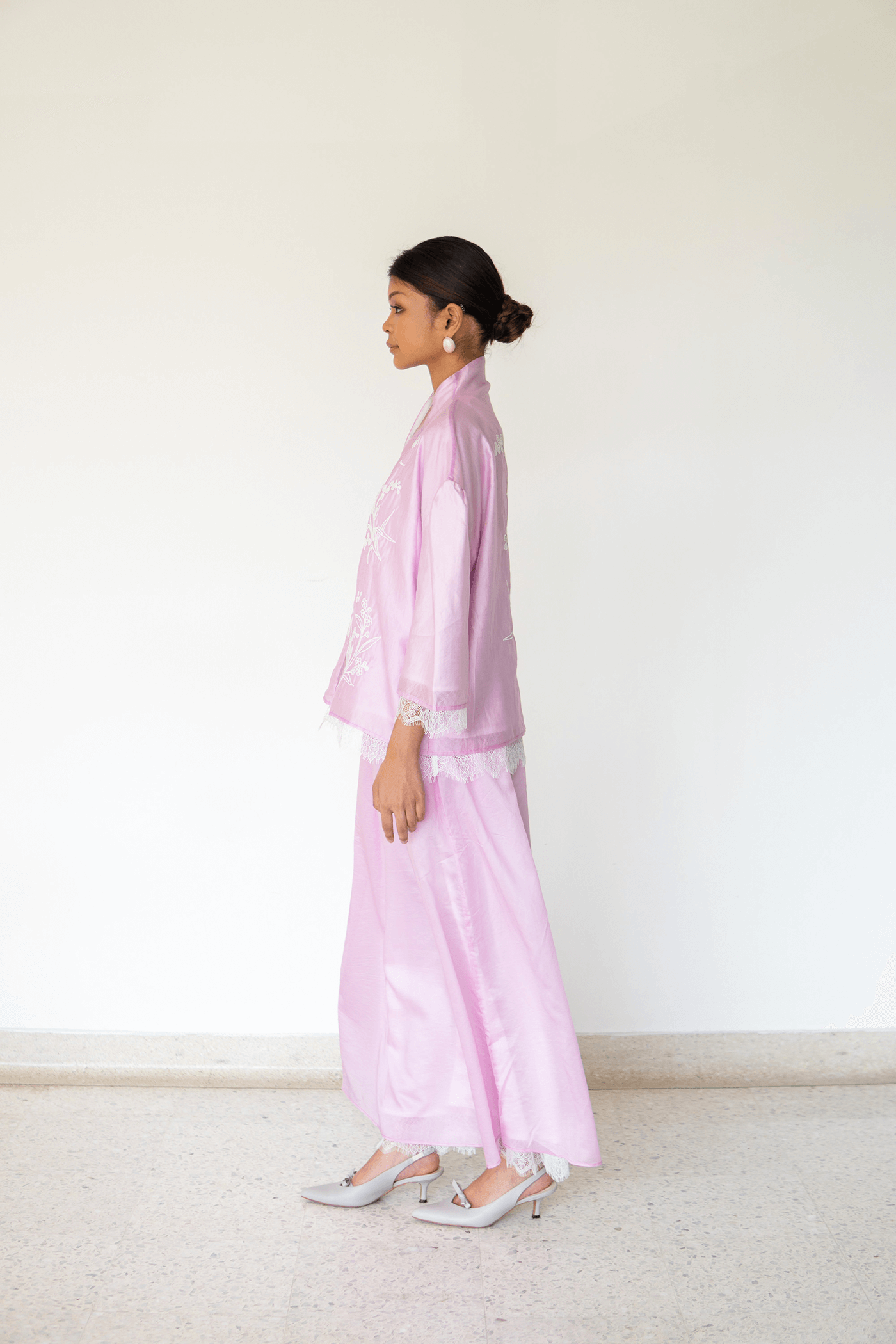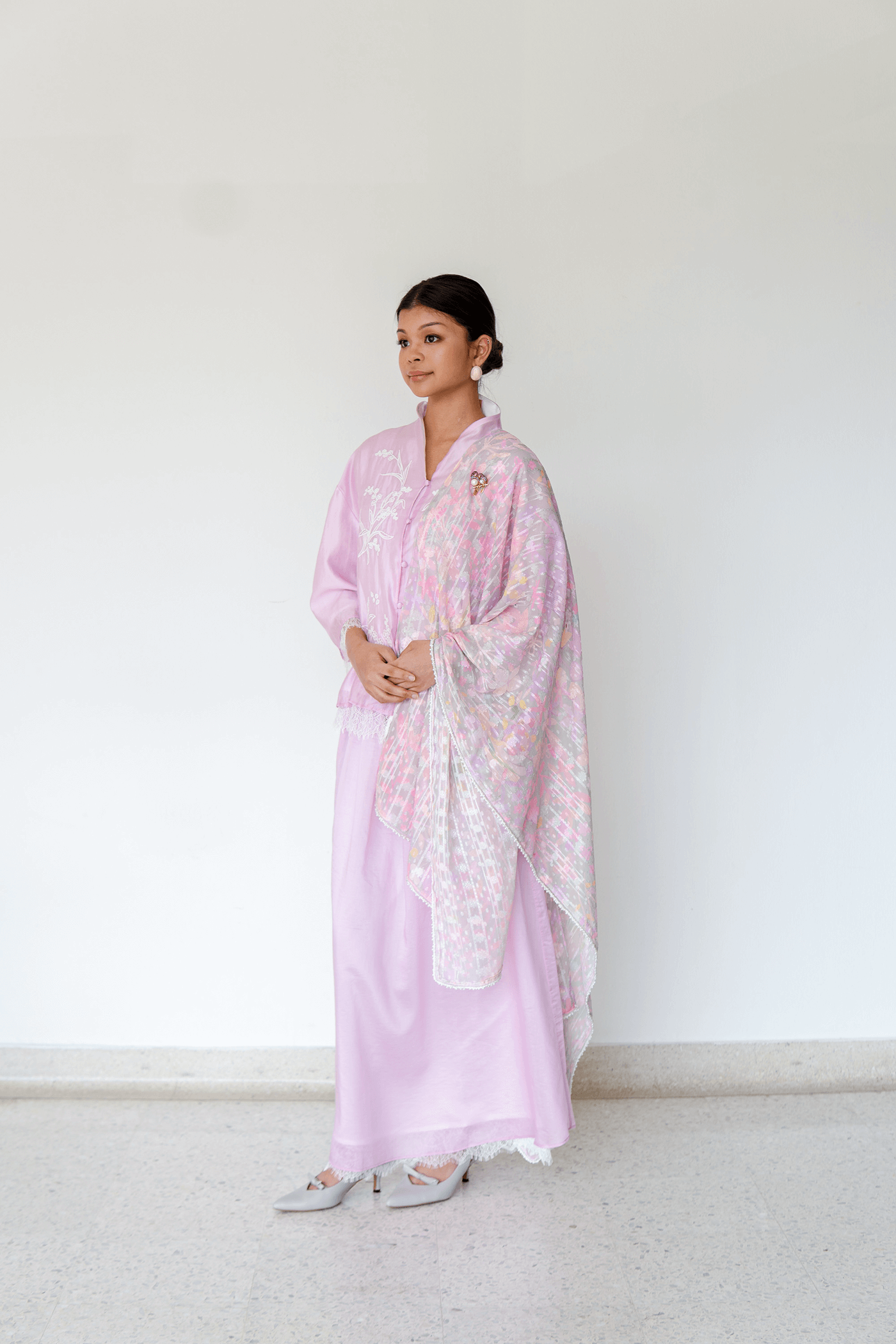 Meet Sienna,a tailored outfit in sumptuous soft fabric, adorned with intricate embroidery and delicate lace accents for a refined, couture-inspired look.